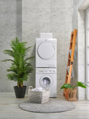 Zdjęcie "Pralka i suszarka w rzędzie, dekoracyjny pokój kąpielowy stylu, koncepcja rogu." może być wykorzystywane do celów osobistych i komercyjnych zgodnie z warunkami zakupionej licencji Royalty-free. Obraz jest dostępny do pobrania w jakości wysokiej rozdzielczości do 5760x3840.