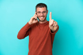 Młody Brazylijczyk odizolowany na niebieskim tle wskazując na bok i wykonując gest milczenia