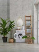 Pralka dekoracyjny styl w łazience, wazon roślin, lustro i drewniane schody, ręcznik i szczotka, brudne ubrania w wiklinowym koszu.