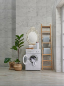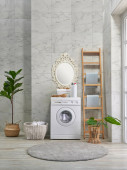 Pralka dekoracyjny styl w łazience, wazon roślin, lustro i drewniane schody, ręcznik i szczotka, brudne ubrania w wiklinowym koszu.