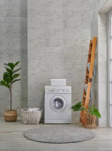 Pralka dekoracyjny styl w łazience, wazon roślin, lustro i drewniane schody, ręcznik i szczotka, brudne ubrania w wiklinowym koszu.