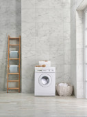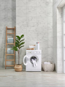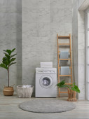 Pralka dekoracyjny styl w łazience, wazon roślin, lustro i drewniane schody, ręcznik i szczotka, brudne ubrania w wiklinowym koszu.