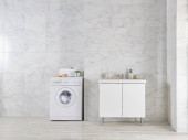 Zdjęcie "Pralka dekoracyjny styl w łazience, wazon roślin, lustro i drewniane schody, ręcznik i szczotka, brudne ubrania w wiklinowym koszu." może być wykorzystywane do celów osobistych i komercyjnych zgodnie z warunkami zakupionej licencji Royalty-free. Obraz jest dostępny do pobrania w jakości wysokiej rozdzielczości do 5760x3840.