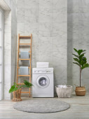 Nowoczesna łazienka z pralką i umywalką, lustro na ścianie, drewniane schody wystrój ręcznika, brudne ubrania w koszu.