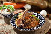 Zdjęcie "Pyszne Pilaf azjatycki z przyprawionej wołowiny żeberka na czerwonym talerzu marokańskim. Widok pionowy z góry, styl rustykalny" może być wykorzystywane do celów osobistych i komercyjnych zgodnie z warunkami zakupionej licencji Royalty-free. Obraz jest dostępny do pobrania w jakości wysokiej rozdzielczości do 5760x3840.