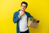Młody biały robi ruch, podnosząc pudełko pełne rzeczy odizolowanych na żółtym tle, chcąc urzeczywistnić rozwiązanie, podnosząc palec do góry.