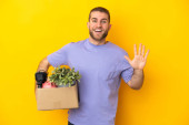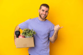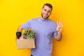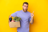 Zdjęcie "Młody biały robi ruch, podnosząc pudełko pełne rzeczy odizolowanych na żółtym tle, chcąc urzeczywistnić rozwiązanie, podnosząc palec do góry." może być wykorzystywane do celów osobistych i komercyjnych zgodnie z warunkami zakupionej licencji Royalty-free. Obraz jest dostępny do pobrania w jakości wysokiej rozdzielczości do 5760x3840.