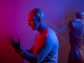 Młoda poważna kobieta w danych dekodujących płaszcz celofanowy