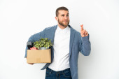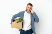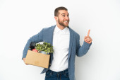 Młody biały robi ruch, podnosząc skrzynkę pełną rzeczy odizolowanych na białym tle, myśląc o pomyśle wskazującym palcem w górę.