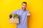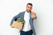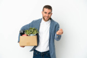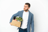 Zdjęcie "Młody biały robi ruch, podnosząc skrzynkę pełną rzeczy odizolowanych na białym tle, chcąc urzeczywistnić rozwiązanie, podnosząc palec do góry." może być wykorzystywane do celów osobistych i komercyjnych zgodnie z warunkami zakupionej licencji Royalty-free. Obraz jest dostępny do pobrania w jakości wysokiej rozdzielczości do 5760x3840.