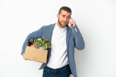 Młody biały robi ruch, podnosząc skrzynkę pełną rzeczy odizolowanych na białym tle, chcąc urzeczywistnić rozwiązanie, podnosząc palec do góry.