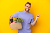 Młody biały robi ruch, podnosząc pudełko pełne rzeczy odizolowanych na białym tle salutując ręką ze szczęśliwym wyrazem twarzy.