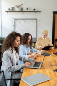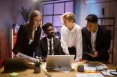 Pewna siebie blond businesswoman robi prezentację dla współpracowników międzykulturowych