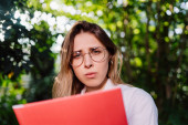 Zdjęcie "Młoda kobieta w okularach wygląda na zszokowaną po sprawdzeniu poczty na laptopie" może być wykorzystywane do celów osobistych i komercyjnych zgodnie z warunkami zakupionej licencji Royalty-free. Obraz jest dostępny do pobrania w jakości wysokiej rozdzielczości do 5760x3840.