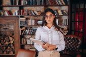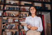Zdjęcie "Młoda kobieta z dokumentami w rękach na tle półki na książki" może być wykorzystywane do celów osobistych i komercyjnych zgodnie z warunkami zakupionej licencji Royalty-free. Obraz jest dostępny do pobrania w jakości wysokiej rozdzielczości do 5760x3840.