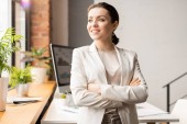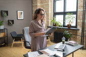 Młoda odnosząca sukcesy bizneswoman z papierami na stanowisku