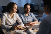 Trzech młodych, pewnych siebie kolegów omawiających dane na ekranie laptopa