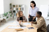 Sukces kobiety w ciąży w inteligentnym ubraniu casualwear prezentacja wykresu finansowego i diagramu