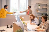 Młoda ciężarna bizneswoman pochylająca się nad biurkiem kolegi