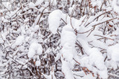 Zbliżenie szczegółowy fotografia drobny leśny krzak z duży śnieg padam na one. Zdjęcie zrobione w chłodny grudniowy dzień.
