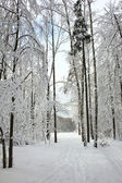 Śnieżnobiała zimowa droga przez mały wiejski las. Zdjęcie zrobione w chłodny zimowy dzień.