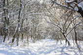 Snowy biały zimowy krajobraz ze śniegiem. Zdjęcie zrobione w pochmurny zimowy dzień.