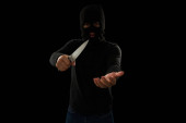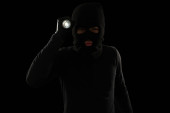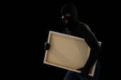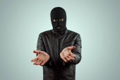 Niebezpieczny złodziej w czarnej masce i rękawiczkach wyłącza kamerę, żeby coś ukraść.