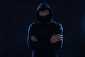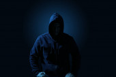 Portret nieznanego hakera ukrywającego się w cieniu z laptopem do nielegalnego hakowania