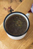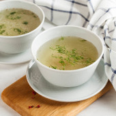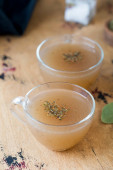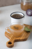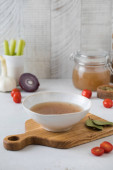 Domowej roboty bulion kostny w kubkach z przyprawami na drewnianym patyku z liściem laurowym.
