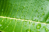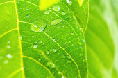 Makro zbliżenie Piękny świeży zielony liść z kroplą wody w słońcu rano natura tło.