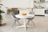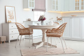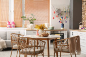 Wnętrze jadalni z zestawem herbaty na okrągłym stole i krzesłami wiklinowymi