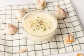 sos szpinakowy z cytryną i czosnkiem na białym tle.