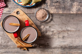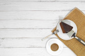 Ciasto Opera deser plasterek na drewnianym stole. Widok góry. Przestrzeń kopiowania