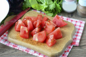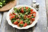 Wypłukać i wysuszyć rukolę. Przenieś rukolę na talerz. Wypłukać pomidory wiśniowe i pokroić na pół. Dodaj pomidory do miski z rukolą.