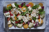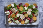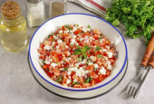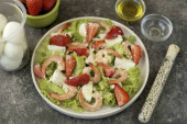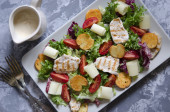 Dodać gotowane krakersy do sałatki, posypać wszystko olejem, dodać sól i pieprz do smaku. Podawać sałatkę z rukolą, pomidorami i grzankami do stołu.