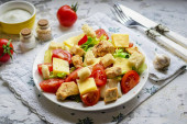 Zdjęcie "Dodać gotowane krakersy do sałatki, posypać wszystko olejem, dodać sól i pieprz do smaku. Podawać sałatkę z rukolą, pomidorami i grzankami do stołu." może być wykorzystywane do celów osobistych i komercyjnych zgodnie z warunkami zakupionej licencji Royalty-free. Obraz jest dostępny do pobrania w jakości wysokiej rozdzielczości do 5760x3840.