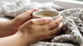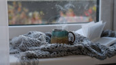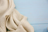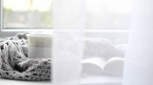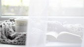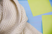 Przytulny dom z filiżanką kawy i książką. Styl Hygge. Kubek czarnej kawy owinięty w ciepłym szalik na drewnianej płycie. Widok z góry, styl Vintage, Martwa żywotność.