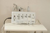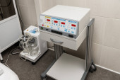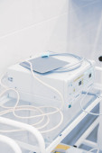Pusta sala operacyjna i nowoczesny sprzęt w szpitalu. Urządzenie medyczne dla chirurga chirurgicznego pacjenta w niebieskim tonie. Zachowaj koncepcję leczenia życia