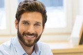 portret wesoły brunetka biznesmen patrząc w aparat fotograficzny w biurze