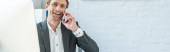 szczęśliwy i stylowy biznesmen rozmawiający przez telefon komórkowy w biurze, baner