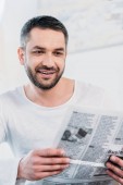 szczęśliwy brunetka biznesmen w czarny marynarka czytanie gazeta odizolowany na szary