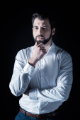 Zdjęcie "Przemyślany biznesmen w czarnym garniturze trzymający infografiki i długopisy odwracając wzrok na szarym" może być wykorzystywane do celów osobistych i komercyjnych zgodnie z warunkami zakupionej licencji Royalty-free. Obraz jest dostępny do pobrania w jakości wysokiej rozdzielczości do 5760x3840.