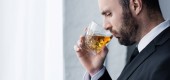 stylowy brodaty mężczyzna pijący whiskey na szarym tle