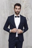 elegancki mężczyzna zapięcie rękaw czarny blezer patrząc na aparat odizolowany na szary