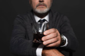 brunetka biznesmen trzyma szklankę whisky i czytać gazetę odizolowany na szary