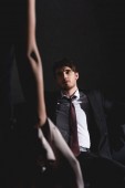zmysłowy Azji kobieta patrząc w aparat w pobliżu stylowy mężczyzna siedzi na szarym tle