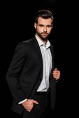 stylowy mężczyzna w czarnej kamizelce i krawacie patrząc w kamerę siedząc odizolowany na szarym