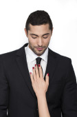 zamazane Azji kobieta dotykając twarz elegancki mężczyzna odizolowany na szary