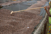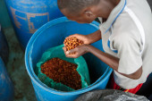 Afrykańscy pracownicy wybierają świeże ziarna kawy w pralni.