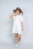 młoda azjatycka kobieta w skórzanym pulowerze, beżowa spódnica i beret patrząc na aparat odizolowany na szary